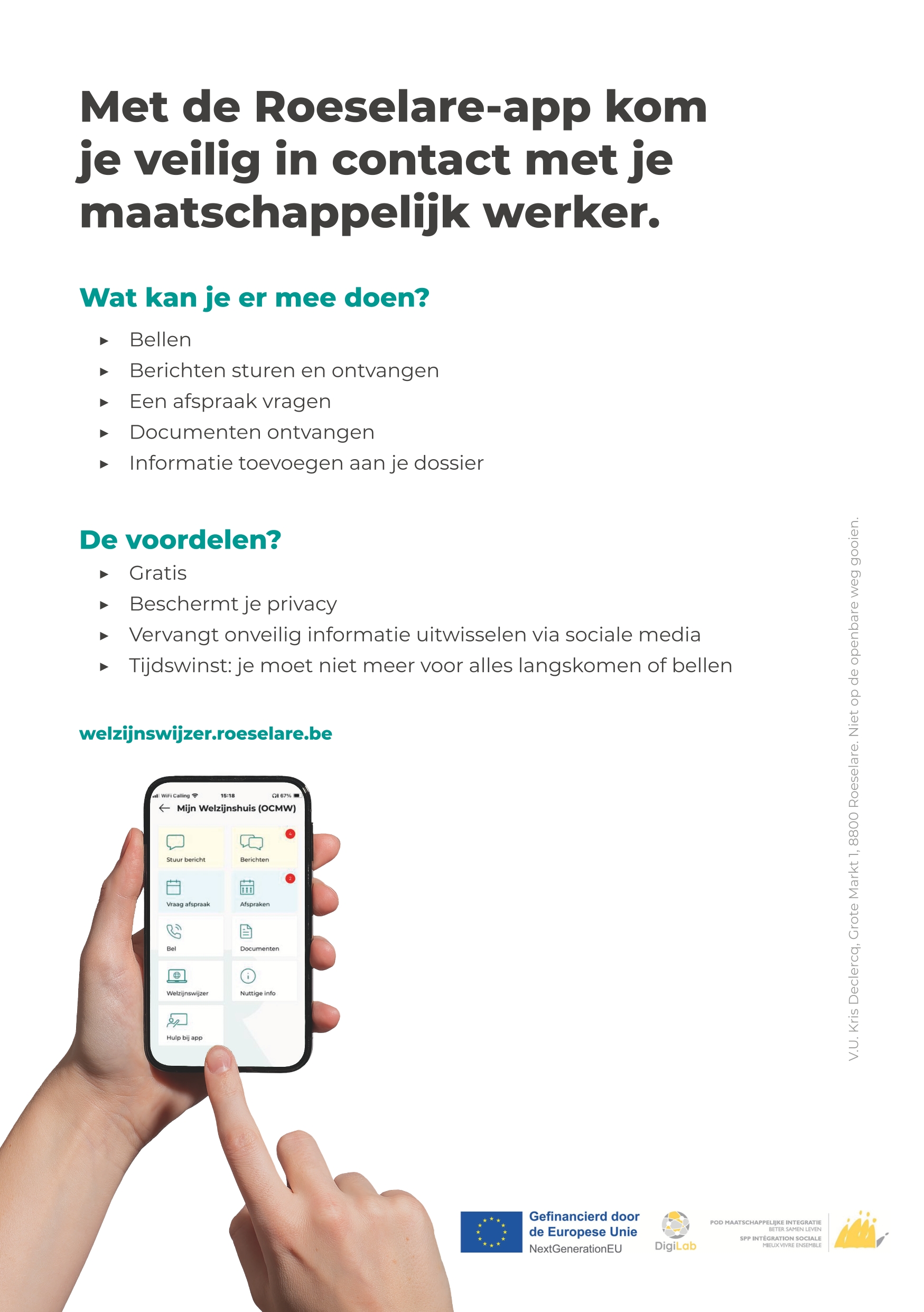 Heb je een vaste begeleider in het Welzijnshuis, dan kan je vanaf najaar 2025 met de Roeselare-App veilig verbinding maken met de begeleider.